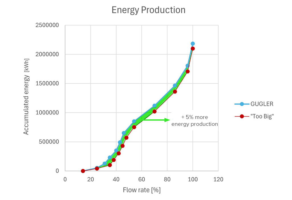 In the field of renewable energy , the prevailing belief is often that a large machine with highest possible nominal power guarantees the highest energy production. However, our extensive experience at GUGLER Water Turbines demonstrates that oversizing a turbine leads to inefficiency, increased investment and operating costs, and a shorter lifespan. The key is precise matching, not maximum size.
