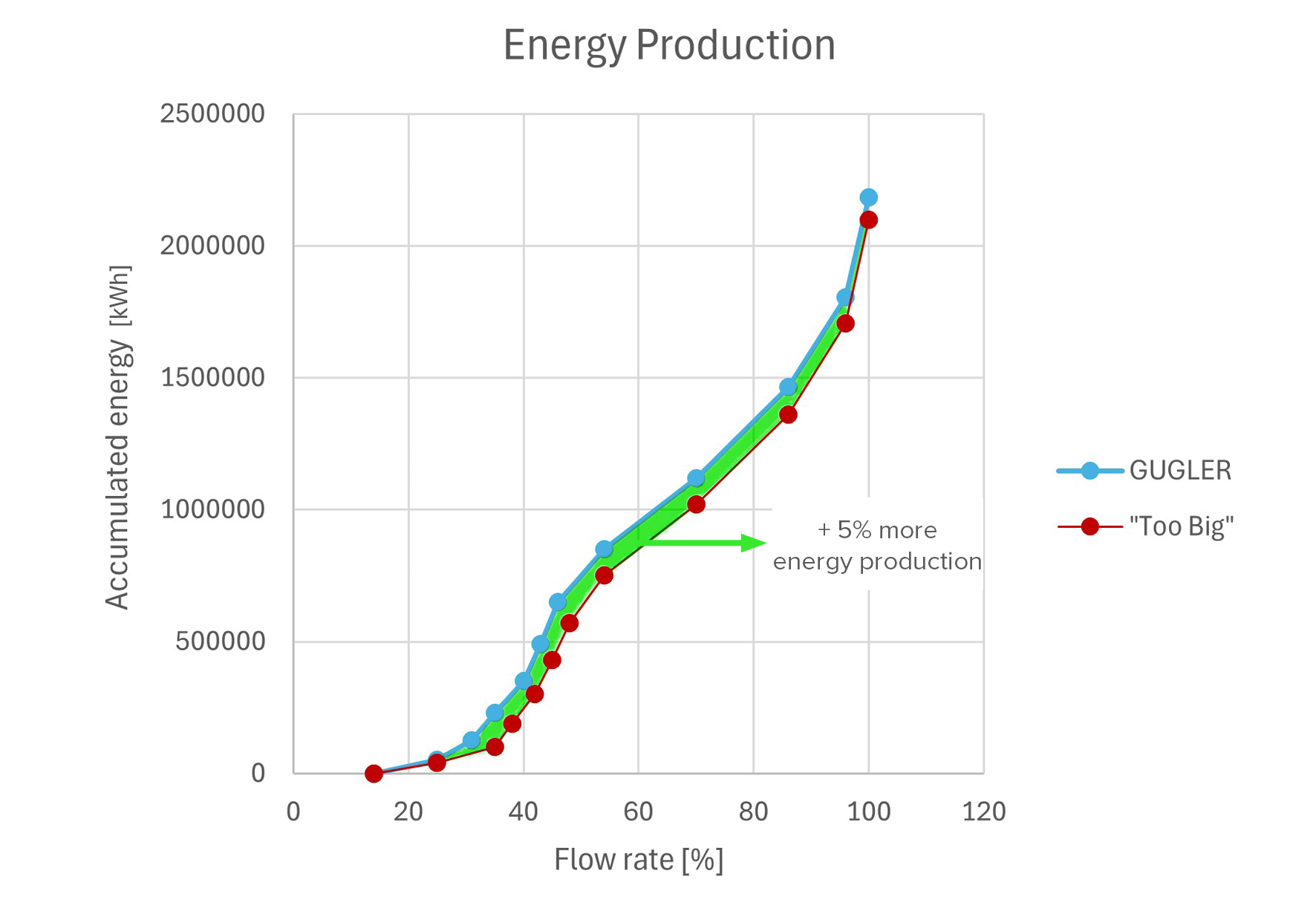 In the field of renewable energy , the prevailing belief is often that a large machine with highest possible nominal power guarantees the highest energy production. However, our extensive experience at GUGLER Water Turbines demonstrates that oversizing a turbine leads to inefficiency, increased investment and operating costs, and a shorter lifespan. The key is precise matching, not maximum size.
